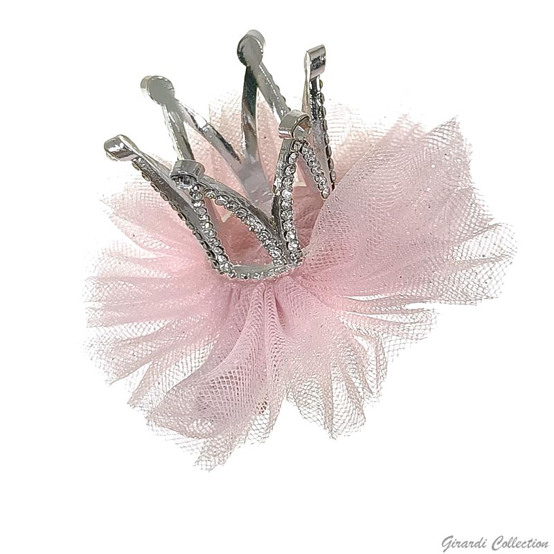 Hair barrette clip with non-slip rubber and rhinestone tiara on coloured tulle.