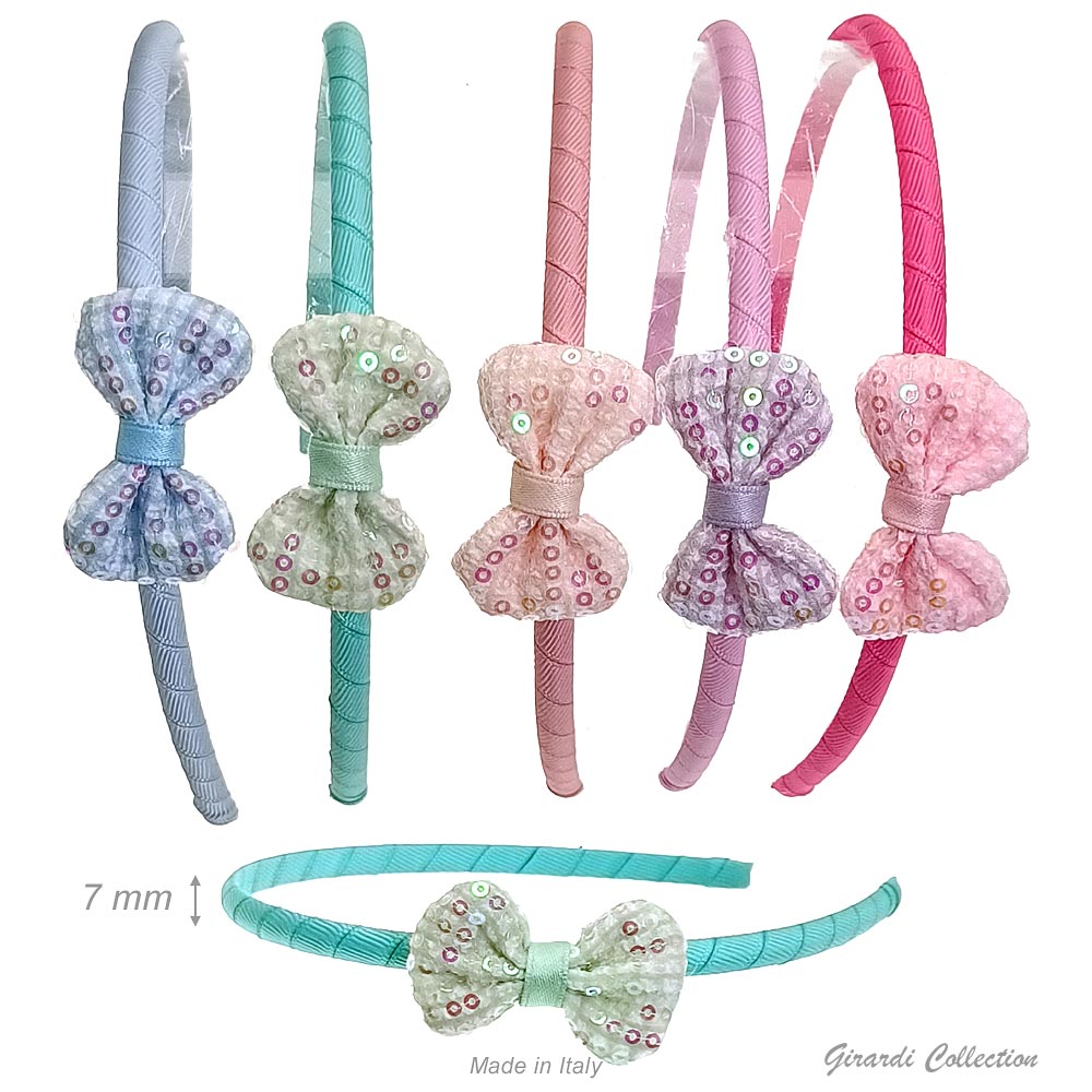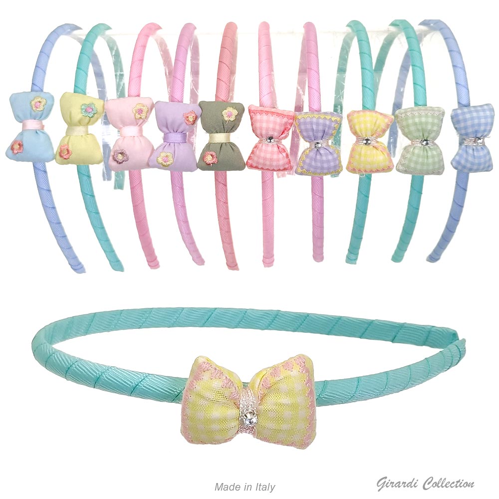 Girl's hairband covered in grosgrain ribbon with padded bow and rhinestones
