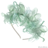 Headband for little girls made of metal covered with colorful ribbon, with the application of tulle flowers and pearls.