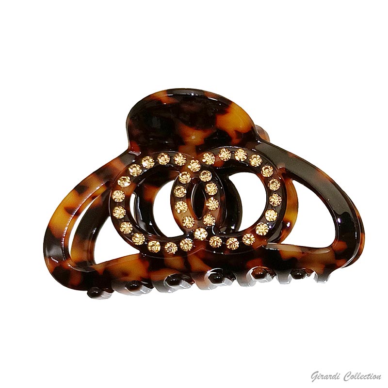 Tortoiseshell oval hair claw in acrylic sheet with double ring covered with rhinestones