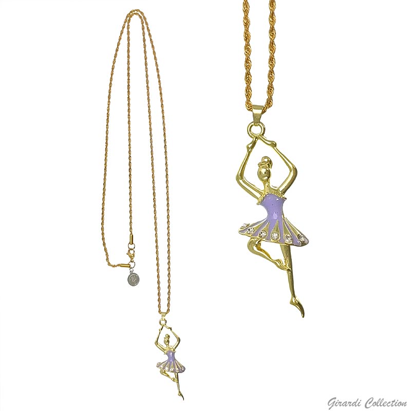 Collana lunga in acciaio dorato con ciondolo in metallo anallergico con ballerina smaltata con strass