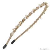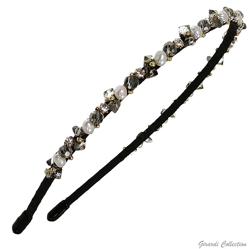 Cerchietto in metallo rivestito di nastro gros grain, decorato con perline, cristalli colorati e strass.
