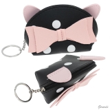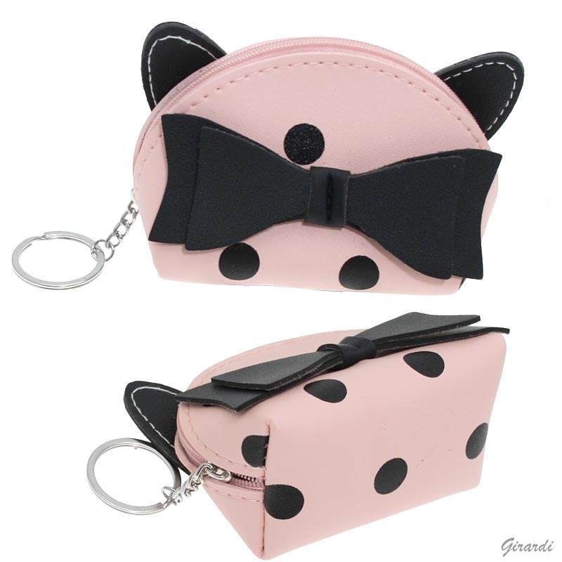 Borsellino portamonete in ecopelle a pois, con applicazione fiocco e orecchie da gatto e portachiavi in metallo.