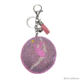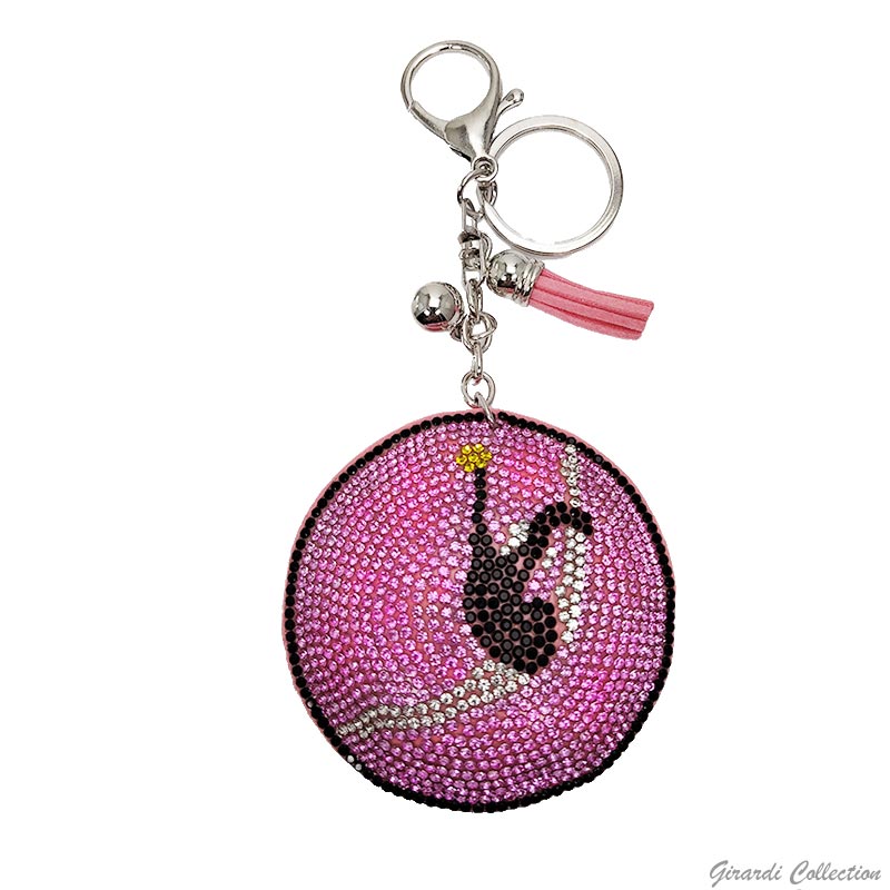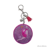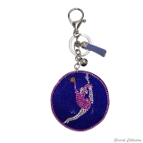 Portachiavi in metallo con disco in tessuto bombato, ricoperto di strass e figura di ginnasta ritmica..